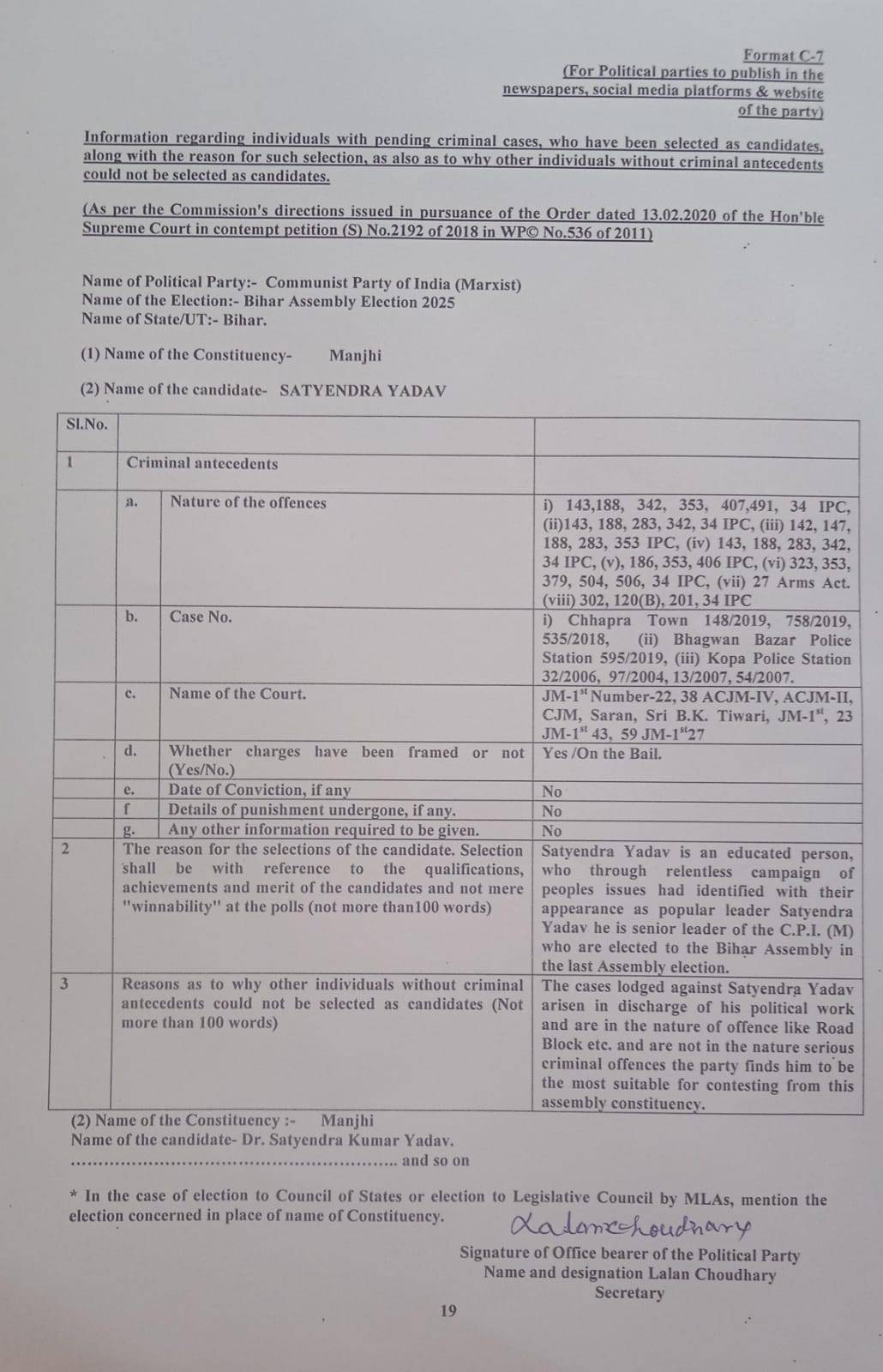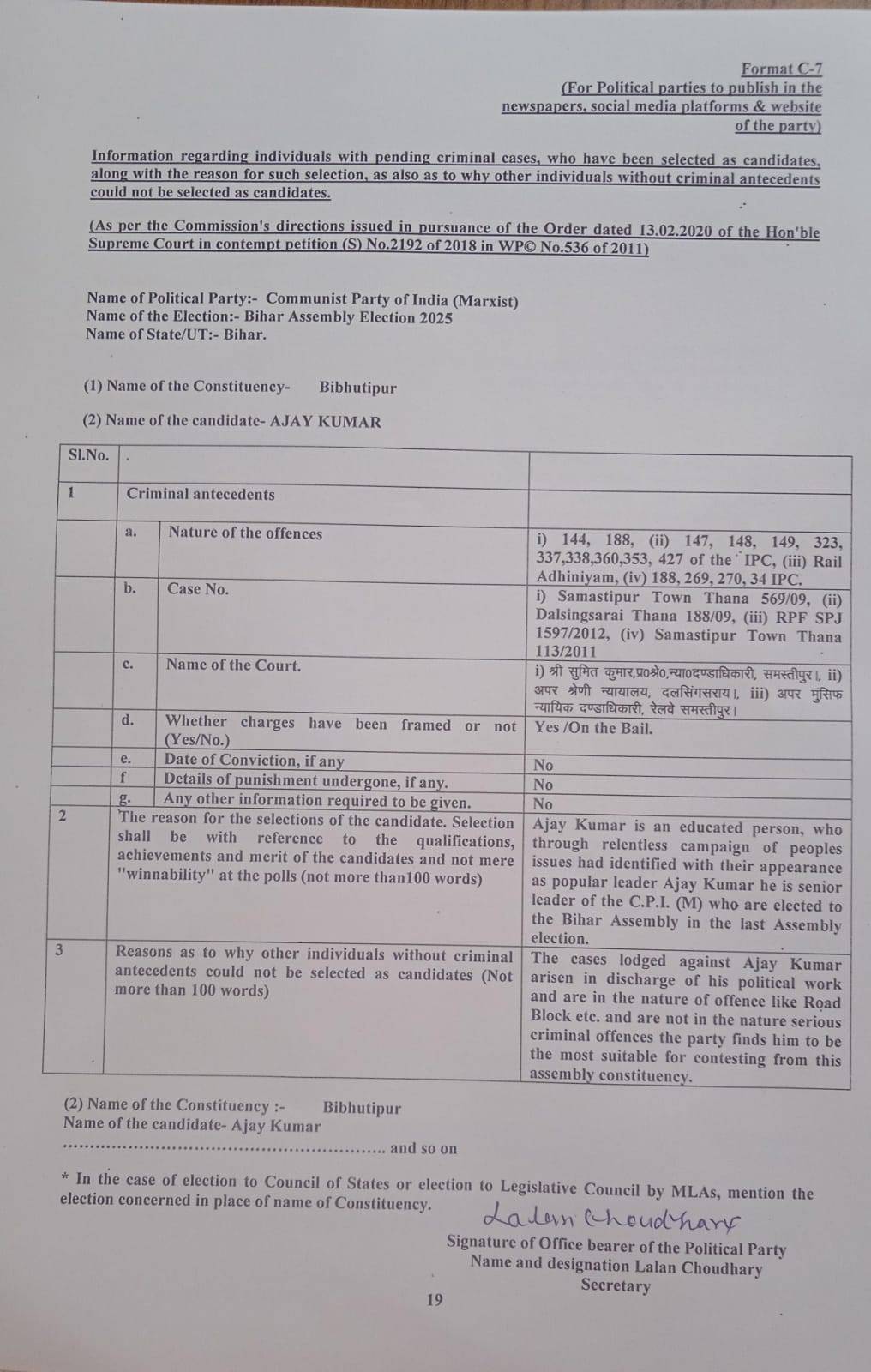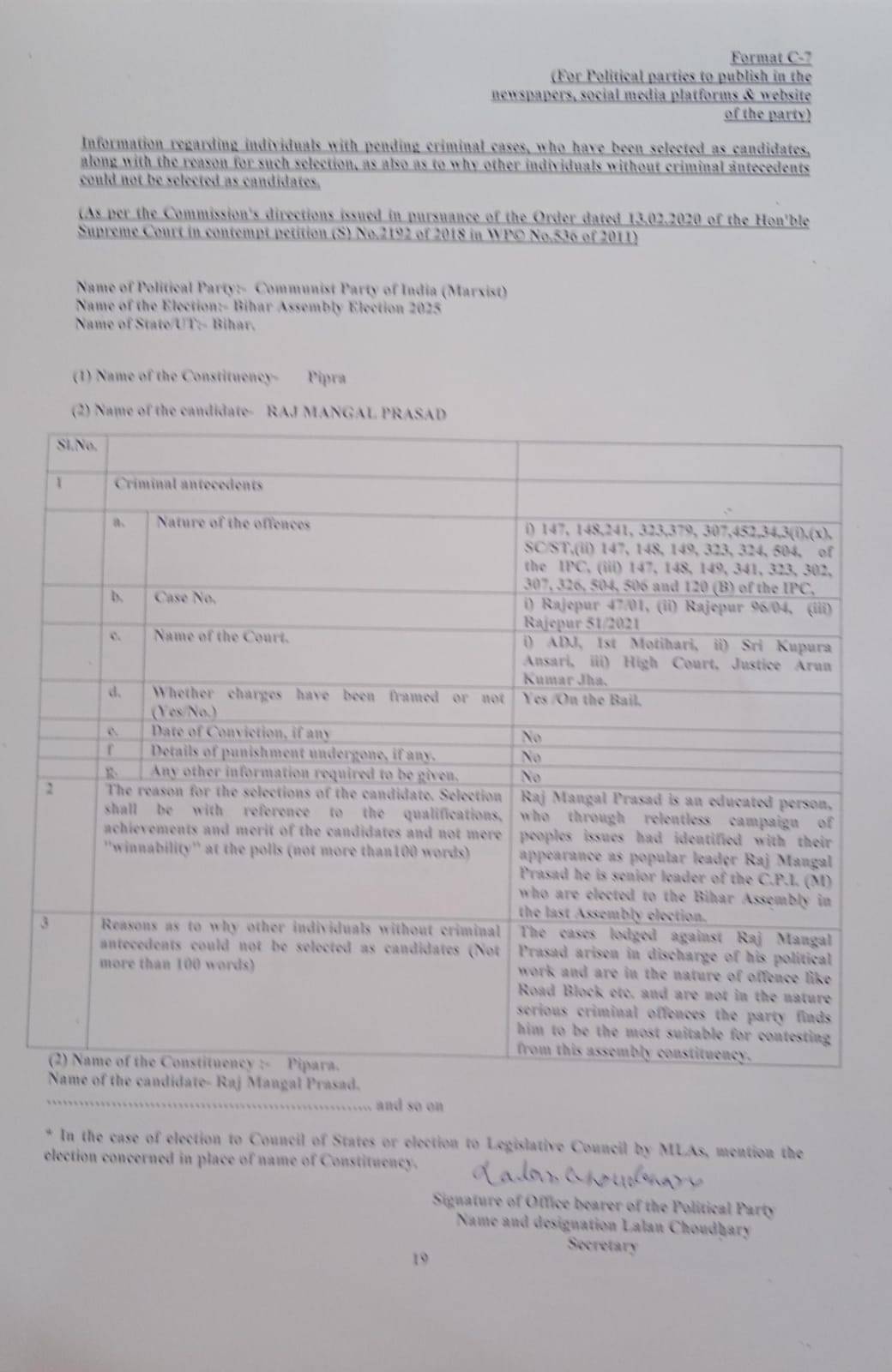 Criminal Antecedent of CPI(M) Candidates Contesting in Bihar elections 2025